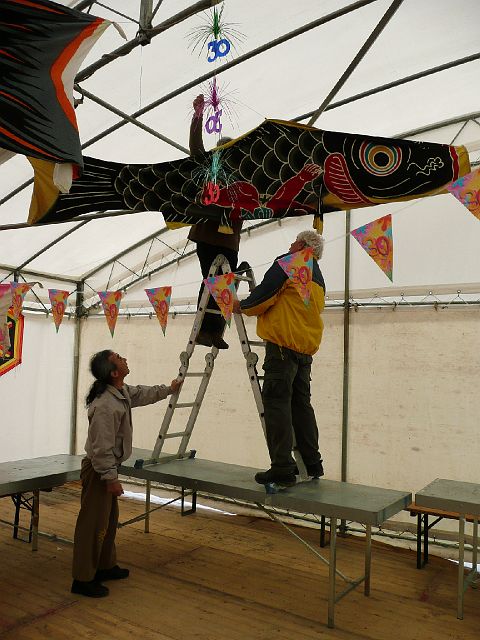 Iqbal, Makoto und Elli hängen japanische Karpfen auf.