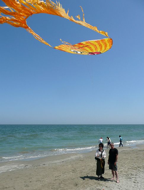 Robert Trepannier und Vania Beaubien beim Strandspaziergang mit Drachen